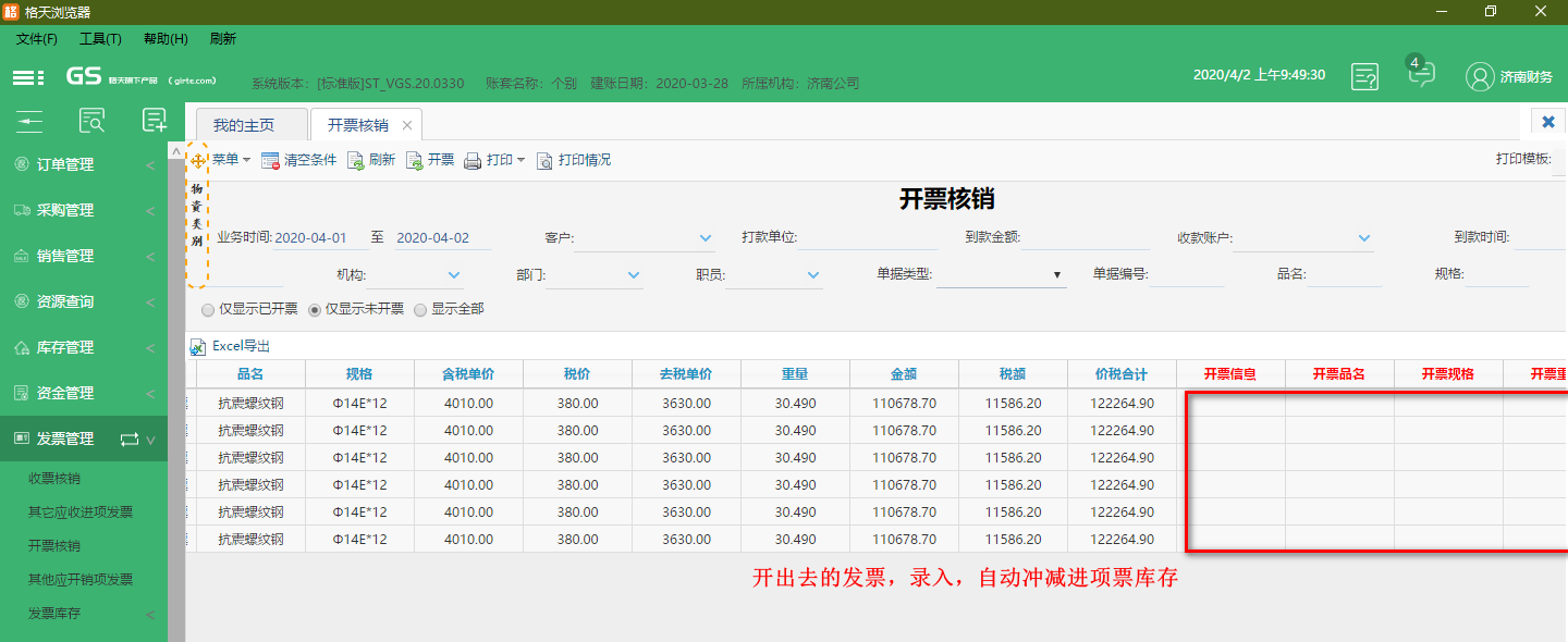 发票管理:钢贸销售,有时会出现税差情况,自动生成发票库存表,可按规格查看发票余量;